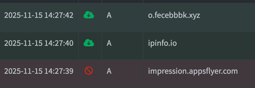 o.fecebbbk.xyz? impression.appsflyer.com? I hadn't opened a browser, installed any apps, or navigated past the home screen. The projector was phoning home on its own. Then: